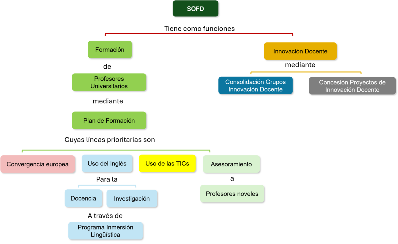 El Servicio consta de 4 áreas: Formación del Profesorado, Tecnología Educativa, Innovación Educativa y Orientación y Tutoría. La función principal es formar, asesorar y apoyar técnicamente al profesorado en el proceso de adaptación a las nuevas exigencias del Espacio Europeo de Educación Superior, así como en la elaboración de los futuros Planes de estudio y en la incorporación de nuevas tecnologías a la docencia universitaria.